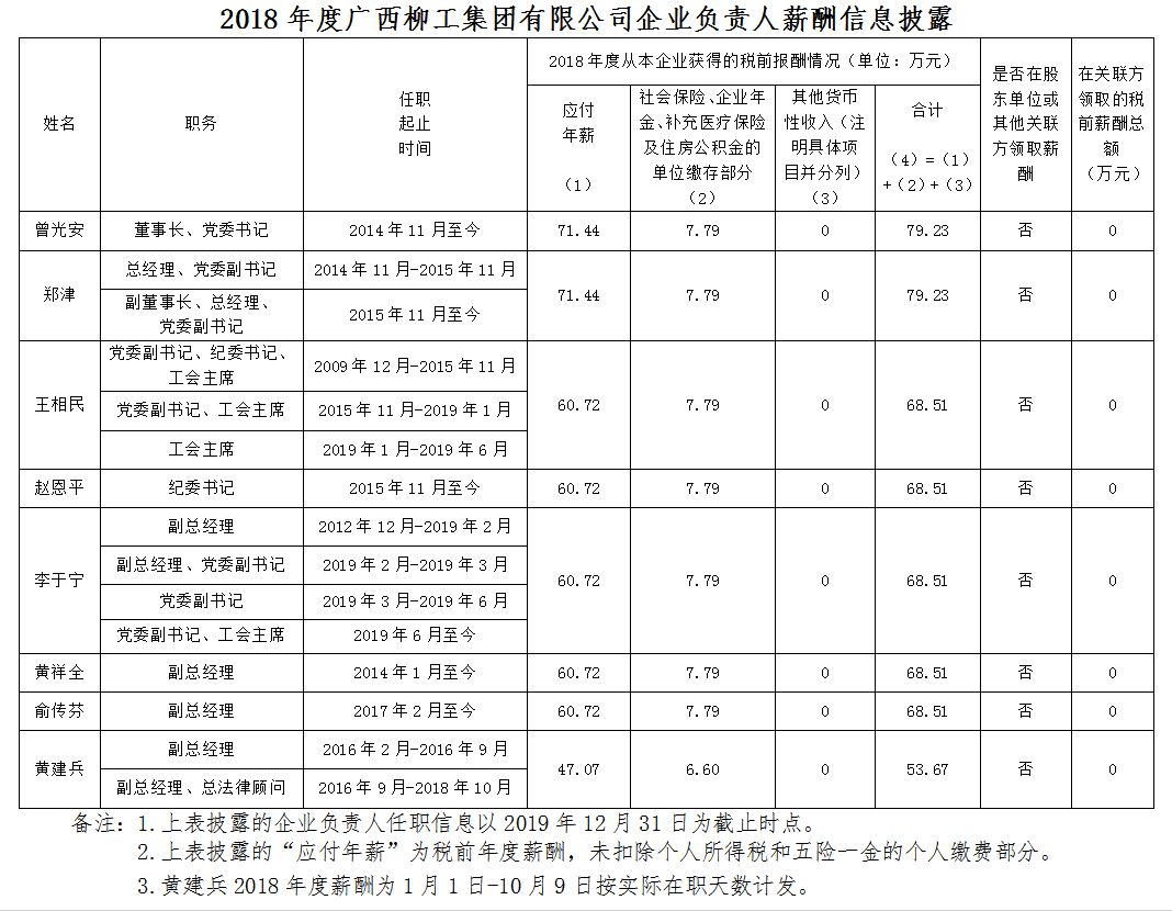 2018年度廣西柳工集團有限公司企業負責人薪酬信息披露