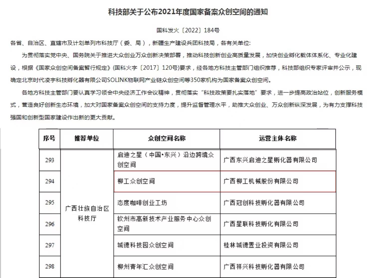 近日,國家科學技術部火炬中心發布了《關于公布2021年度國家備案眾創空間的通知》,柳工眾創空間獲評國家級備案眾創空間。