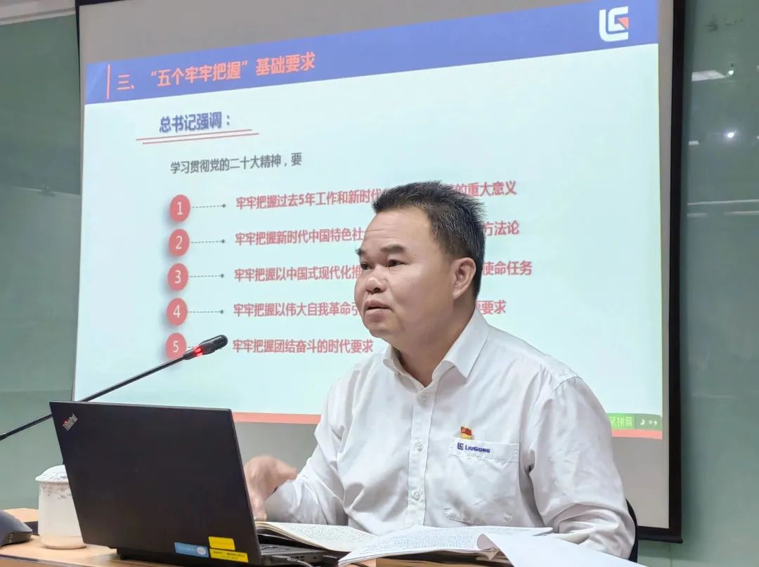 近日,廣西柳工集團有限公司黨委書記、董事長鄭津向所在集團機關(guān)黨支部講授了題為“踔厲奮發(fā)擔(dān)使命 勇毅前行譜新篇”的黨的二十大精神專題黨課。廣西柳工集團有限公司黨委副書記、紀委書記、工會主席賴頌平、支部全體黨員、總監(jiān)人員及入黨積極分子等參加會議。