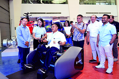在全球研發中心展廳,代表團一行深入了解柳工從創立至今在技術創新、市場拓展等方面的輝煌成就。現場觀看完5G智能遙控電動裝載機的鏟裝作業演示后,代表團成員還體驗了遙控駕駛,這一智能技術應用成果讓代表團大開眼界。