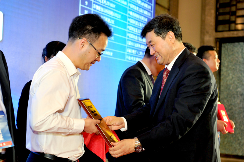 中國(guó)工程機(jī)械工業(yè)協(xié)會(huì)秘書長(zhǎng)蘇子孟(右)為獲獎(jiǎng)的廣西柳工股份公司頒獎(jiǎng)