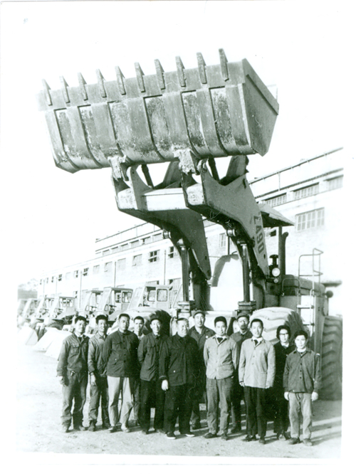 1975年,柳工成功研制了ZL90裝載機,并于1977年通過國家鑒定。圖為ZL90研制小組成員在機器前合影