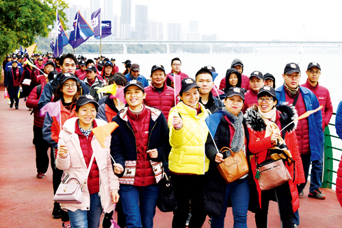 隨著曾光安的一聲啟動號令,23個基層單位代表隊整齊有序地從起點出發。徒步中,天空飄起了蒙蒙細雨,接近冰凍的天氣讓大家不禁在寒風中瑟瑟發抖,但腳下的步伐卻卻絲毫沒有減慢,沿著濱水大道邊聊邊走,感受著沿途的美麗風景、分享著共同迎接新年的喜悅。“這樣的天氣能有這么多人,很熱鬧,讓人很有干勁。”來自集司機關的董先生說,“舉辦這次活動一方面是讓大家從繁忙的工作生活中釋放出來,強身健體;同時,對參與者的意志品質也是一種鍛煉。”